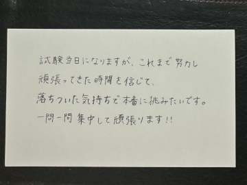 試験当日になりますが、これまで努力し頑張ってきた時間を信じて、落ち着いた気持ちで本番に挑みたいです。