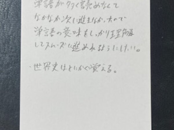 今日は数学の苦手なルートを勉強しました。まだまだ法則を理解しおらずまちがえもありましたが、分かりやすく教えていただき、もう一度同じところを復習し、スラスタできるように努力したいです。英語も単語の意味や使い分けを理解できるよう、調べながら書いてのくりかえしで復習していきます。 高卒…